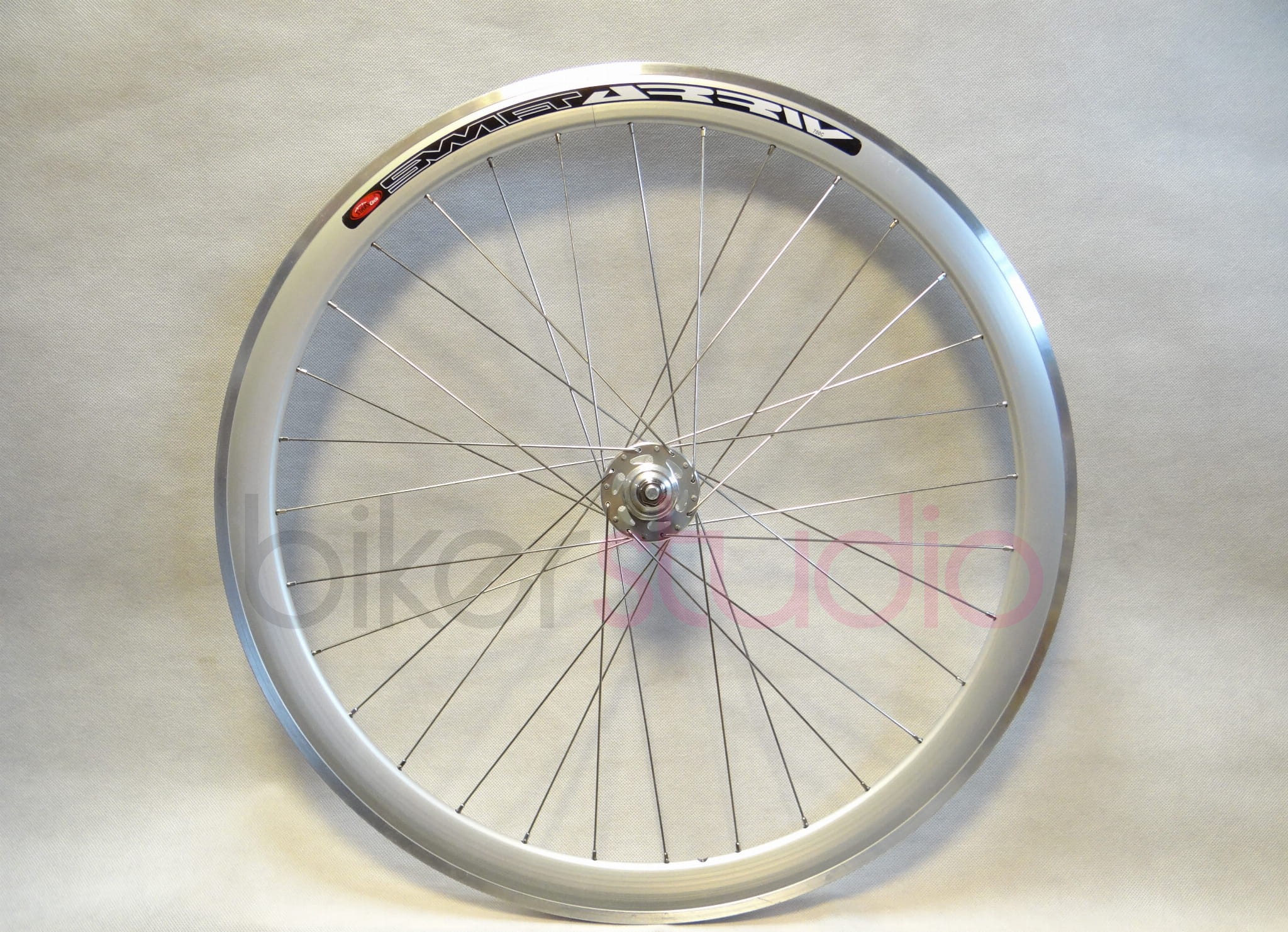 - Obręcz: Swift Arriv ze stożkiem 43mm w kolorze srebrnym, z rantem pod hamulec